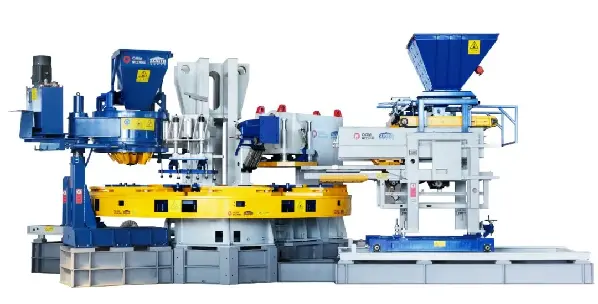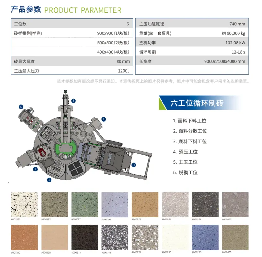 Статичната преса с въртяща се маса HP-1200T креативно разделя процеса на производство на тухли на 7 станции, подредени в кръгово оформление, намалявайки подовото пространство и има голяма площ за формоване и диапазон на височина на формоване, гарантирайки, че разнообразните изисквания на клиентите за продукти от имитация на каменни бетонни блокове са изпълнени, запълвайки празнината в домашните ротационни машини за имитация на каменни тухли със седем станции. Неговият формулиран групов стандарт „T/CCMA 0125-2022 Ротационна многостанционна статична пресова машина за формоване на бетонни блокове“ е избран като един от 100-те групови стандартни демонстрационни проекта за приложение на Министерството на промишлеността и информационните технологии през 2023 г.