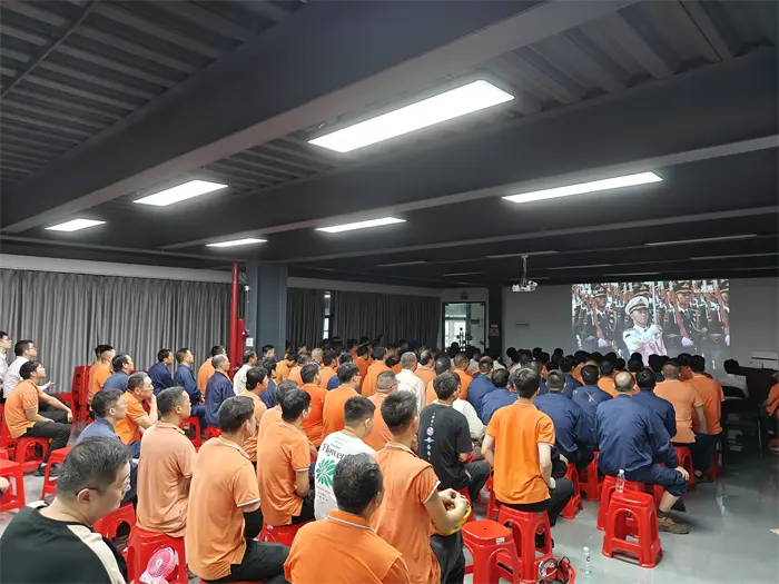 3 септември беше ден от голямо значение за целия китайски народ. На този специален ден председателят на Fujian Quangong Machinery Co., Ltd Fu Binghuang и генералният мениджър Fu Xinyuan поведоха всички служители в конферентната зала на компанията, за да гледат големия военен парад и да станат свидетели на този вълнуващ исторически момент.