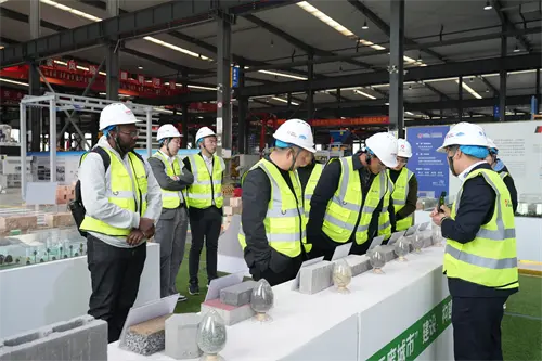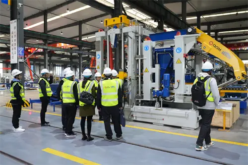 Влизайки в интелигентната производствена работилница на QMG, посетителите наблюдават напълно автоматичната машина за формиране на блокове отблизо. Тялото на машината с тегло стотици тонове, хидравличната система с прецизна трансмисия, модифицираната единица с персонализирано превключване ... "Това оборудване бързо се адаптира към нуждите на клиентите чрез модулен дизайн. Вицепрезидентът и неговата партия високо разпознаха модела на задвижване на двойните колела на" оборудване + строителни материали на QMG "," от продажбата на оборудване за осигуряване на цялостно решения, QMG наистина е отворила веригата за продажба на оборудване за продажба. "