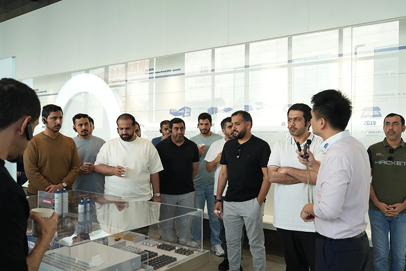 В контролния център на Intelligent Equipment Cloud Service Platform делегацията наблюдава интелигентен сценарий за работа и поддръжка, демонстриращ как оборудването може да се наблюдава от разстояние. Като основна иновация на Quanzhou Machinery, тази платформа интегрира авангардни технологии като облачни изчисления, големи данни и изкуствен интелект. Той може да събира оперативни данни в реално време от над 1000 единици интелигентно оборудване по целия свят, позволявайки пълни функции за управление на жизнения цикъл, включително онлайн наблюдение, отдалечени надстройки, прогнозиране и диагностика на грешки и оценка на здравето на оборудването. Членовете на делегацията попитаха за случаите на приложение на платформата и скоростта на реакция на услугата в Близкия изток, като високо похвалиха нейните ефективни и евтини решения за работа и поддръжка за задгранични клиенти. Те вярваха, че тази технология напълно отговаря на търсенето на инфраструктурния сектор на ОАЕ за интелигентно и ефективно оборудване.